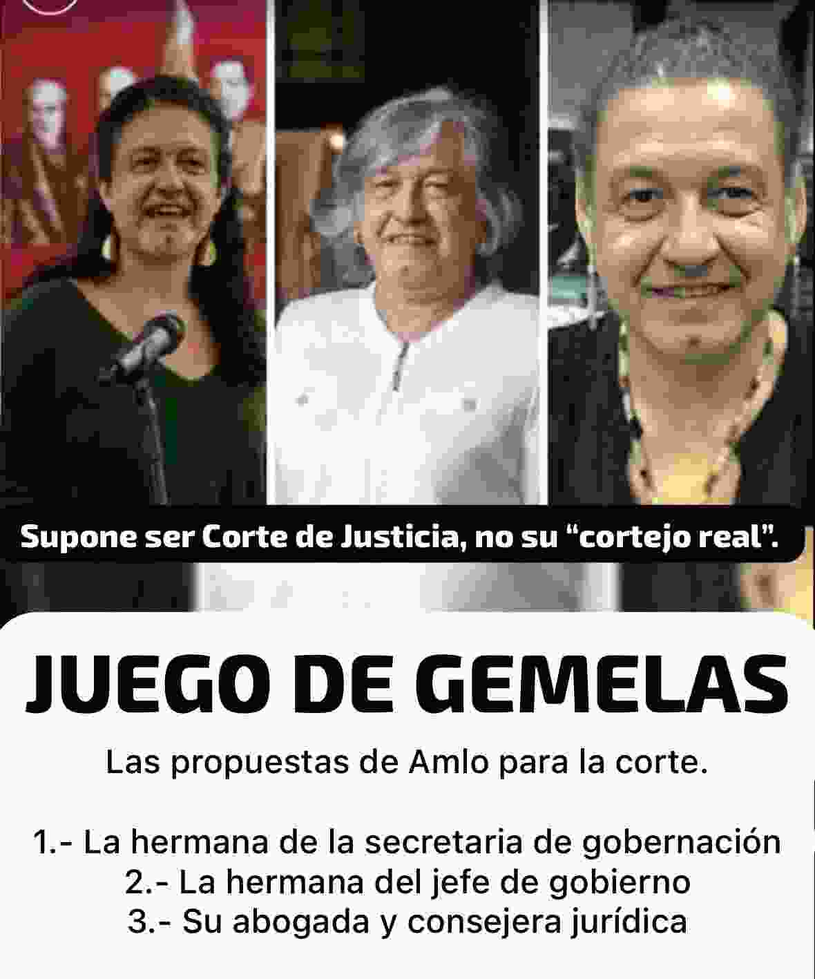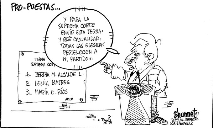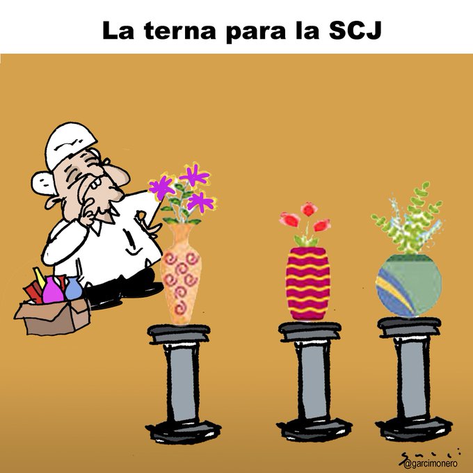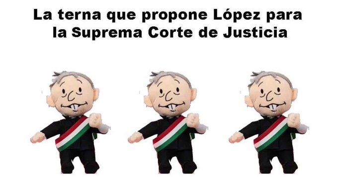 El presidente López Obrador ya tiene lista la terna para suplir al ex-Ministro Arturo Zaldívar en la Suprema Corte de Justicia de la Nación y la envió al Senado de la República. Las propuestas para sustituir a Arturo Zaldívar son: Bertha María Alcalde Luján actual asesora jurídica de la Comisión Federal de Protección contra Riesgos Sanitarios (Cofepris) y hermana de la secretaría de Gobernación Luisa María Alcalde y he hija de Bertha Luján Uranga, quien a representado varios cargos al interior de Morena, y su padre, abogado de varias asociaciones sindicales entre las cuales la de Aeroméxico, quien hace poco vendió la marca de Mexicana de Aviación al gobierno federal, Lenia Batres Guadarrama, consejera adjunta de Legislación y Estudios Normativos de la Consejería Jurídica del Ejecutivo Federal y hermana del jefe de gobierno de la Ciudad de México, Martí Batres; y María Estela Ríos González, consejera jurídica del Ejecutivo Federal. El problema es que las 3 son militantes activas de Morena. Al parecer Morena es como los políticos de siempre que todo da a sus amigos y compadres, sin importar su capacidad o talento, solo hay que obedecer ciegamente a los caprichos del rey Macuspano, esperemos que eso cambie en el próximo sexenio